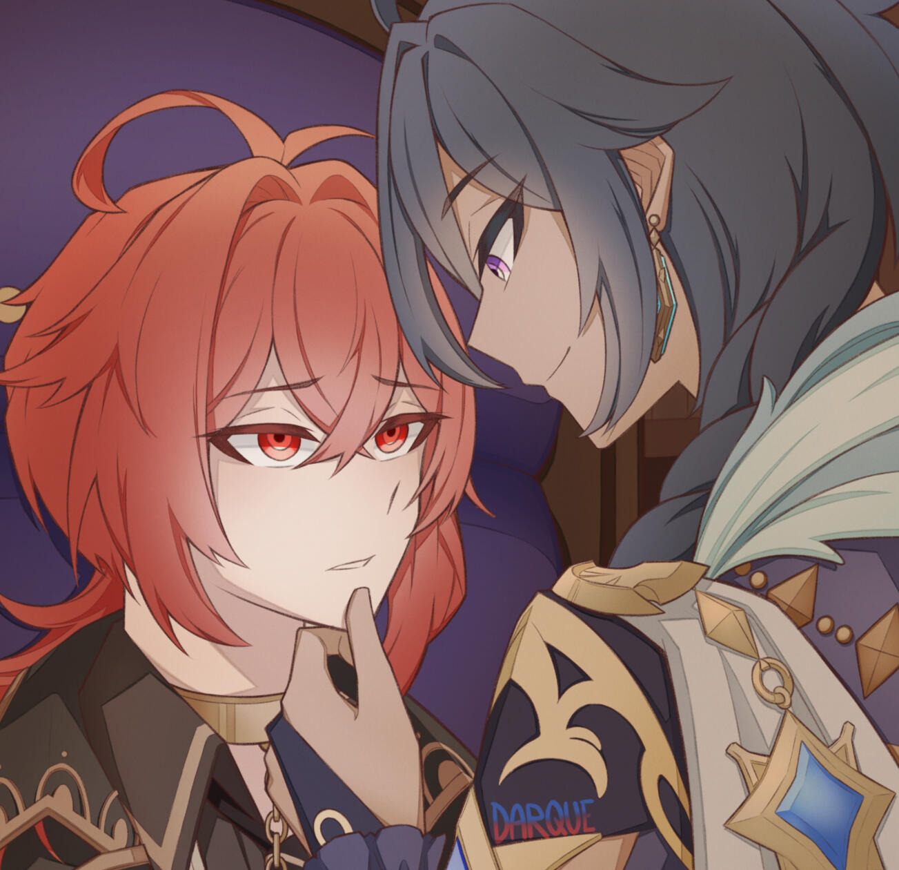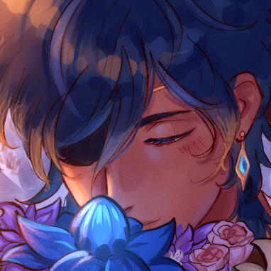 Who is Diluc?For Kaeya… he is a hot summer spent beneath the shade; a soul-uprooting tempest; the warmth of a hearth in the dead of winter; a blade stuck in his heart; a cut that never quite heals; the reason for his sleepless nights; the cause for adrenaline rush; his deadly poison more intoxicating than the wine he sells; but now a man unveiled and at his complete mercy. No one but Kaeya will ever see Diluc's real face. His vulnerability Kaeya's treasure alone.Captured light scintillates on the night's canvas where Kaeya traces the golden embroidery of Diluc's coat. He runs his fingers along the tassels on the back of the coat as if playing with weaved sunlight.Liquid darkness drips to the floor and scatters like black feathers hiding secrets as Diluc sheds his coat. Stirs the ashes of lost shadows, holding the truth of a centuries-old wine bottle.Molten fire spills over Diluc's shoulders when Kaeya releases the red mane from the elastic. His thick, fluffy locks are as untamed as the heart of wine. Kaeya wants to drown in this blood of dawn.