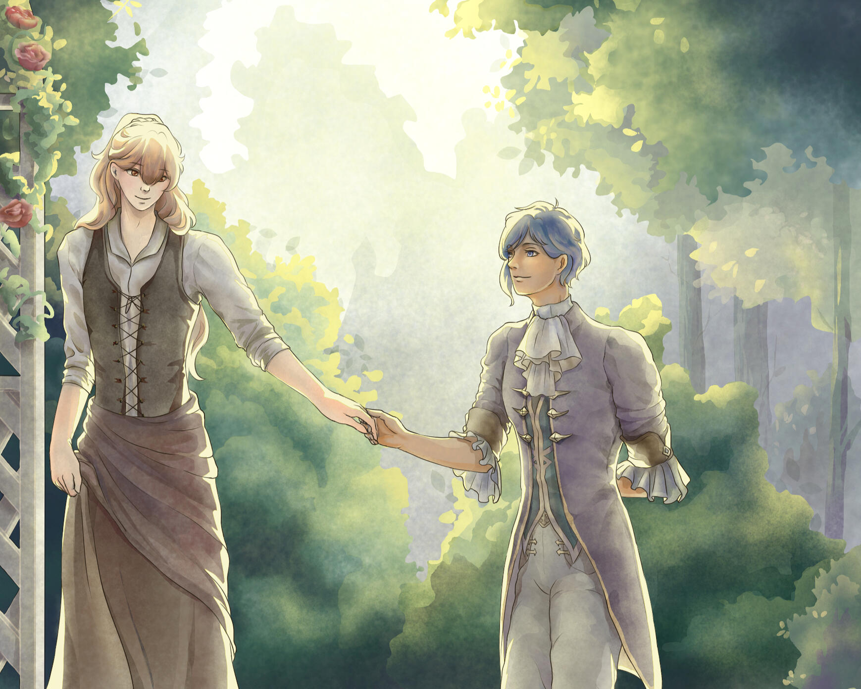 Kaeya wriggles his fingers. Diluc feels rather self-conscious when he places his hand into his, but Kaeya simply grins wider and links their fingers together. “Now, let’s get going, shall we?”